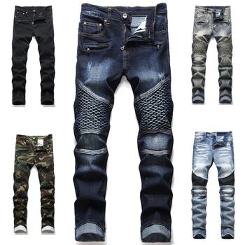 กางเกงยีนส์2022สำหรับผู้ชายกางเกงยีนส์ผ้ายืดหยุ่นพรางตาระดับเข่ากางเกงผู้ชายไฮสตรีทไบค์เกอร์บัลแมนทรงสลิม